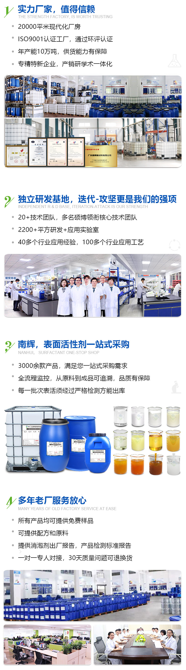 廣東南輝新材料有限公司,是一家致力于表面活性劑研發(fā)、生產(chǎn)、銷售為一體的國家高新技術企業(yè),擁有獨立的研發(fā)基地,主要研發(fā)產(chǎn)品有:乳化劑、滲透劑、勻染劑、司盤、吐溫、消泡劑等3000余款產(chǎn)品。南輝擁有20000平方米的現(xiàn)代化生產(chǎn)車間,年產(chǎn)能可達10萬噸。通過ISO9001:2015質(zhì)量管理體系認證,已獲得十余項不同產(chǎn)品的發(fā)明專利授權(quán),被評為廣東省"專精特新"企業(yè)。從2018年開始批量出口至俄羅斯、日本、馬來西亞、印度、秘魯?shù)葒?,已成為國?nèi)目前主要的表面活性劑生產(chǎn)廠家。